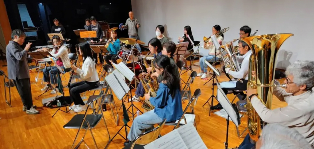 (画像:美方郡吹奏楽団スパパラダイス・ウインドオーケストラ練習風景。)